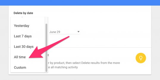 Select “Delete activity by” and then in the drop-down menu choose “All time.” You can also opt to delete data within a specific time period by selecting certain dates in the drop-down menu.